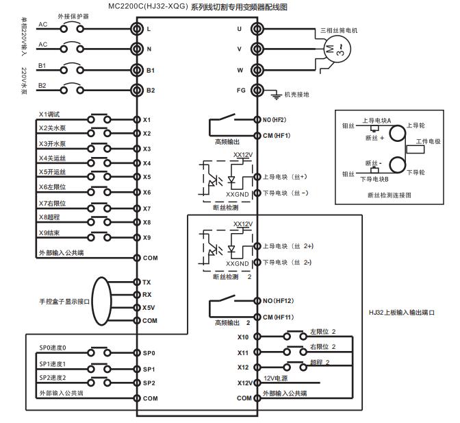 MC2200C /HJ32、MC3300/HJ33 線切割專用變頻器是我司針對線切割機床市場推出的一系列專用變頻器,集成了傳統(tǒng)通用變頻器功能+PLC(單片機控制)功能+外置手控盒功能;使用我司MC2200C/HJ32、MC3300/HJ33 系列線切割專用變頻器只需將外部信號直接接入相對應端口即可實現(xiàn)所有控制,與通用變頻器相比省去眾多不必要的參數(shù)設(shè)置,安裝接線使用更簡單方便。